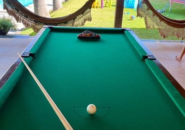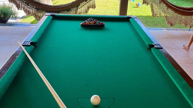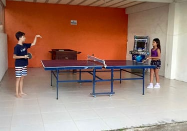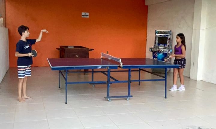 Mesa de ping-pong, totó (pimbolim) e fliperama com diversos jogos