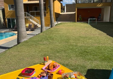 Mesinha com 4 cadeiras, pula-pula 2,5m, escorregador, travinha de gol e 3 gangorras tipo cavalinhos de chão