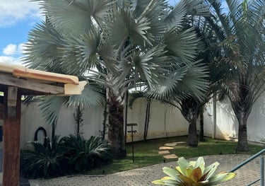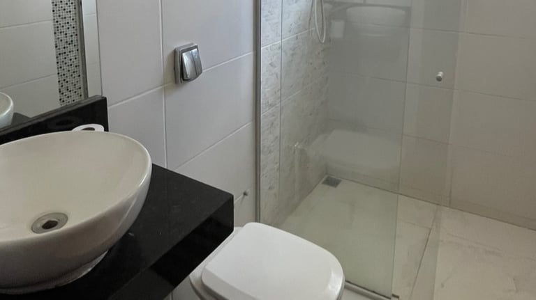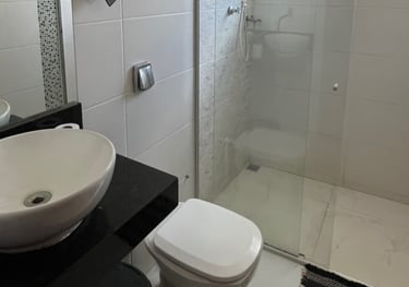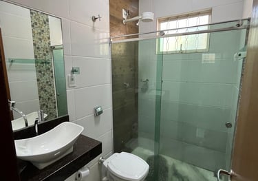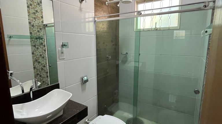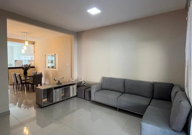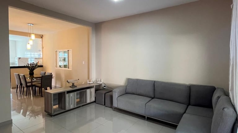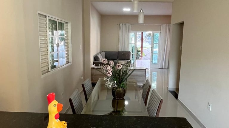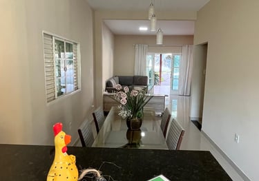 Casa moderna com 3 quartos, sendo 1 suíte com cama de casal e 2 quartos para 3 pessoas (cada), sala ampla, banheiro social, sala de jantar e cozinha.