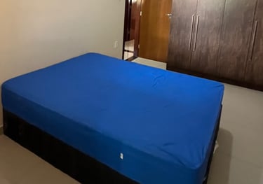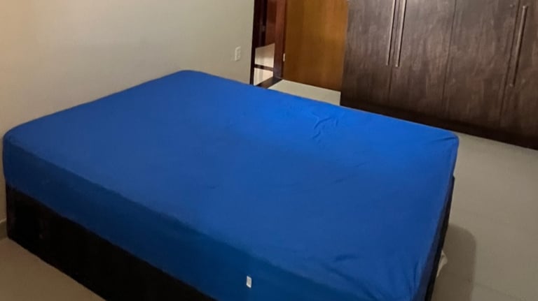 Suíte com cama de casal, armário grande, ventilador de teto, travesseiros e tela mosquiteiro.