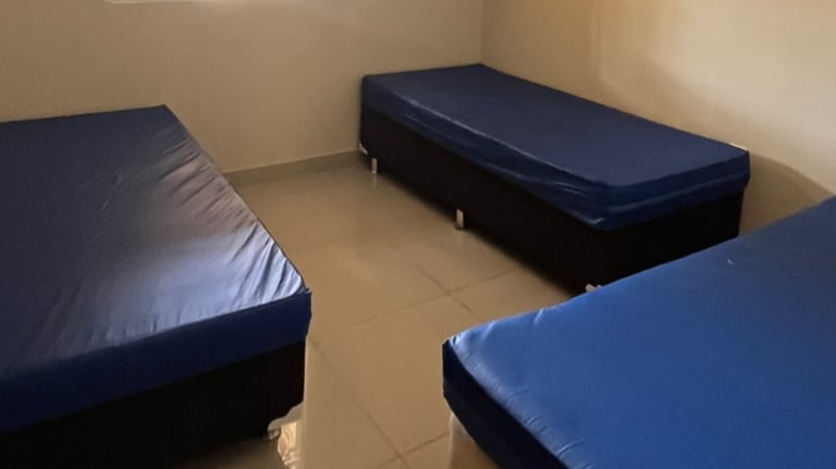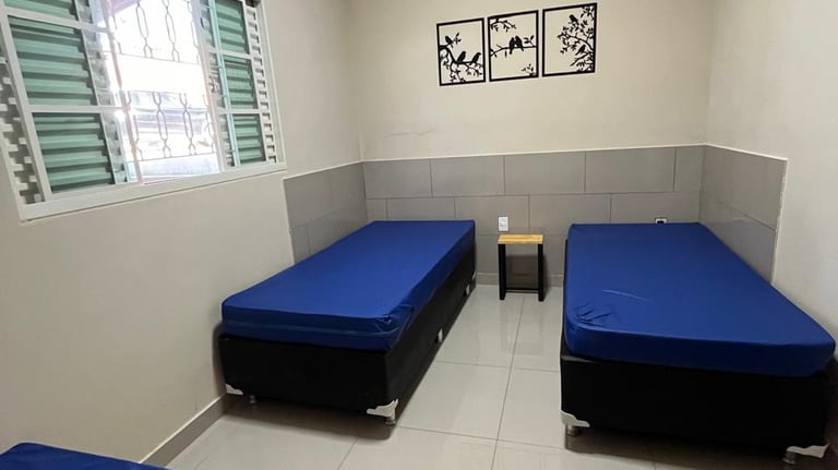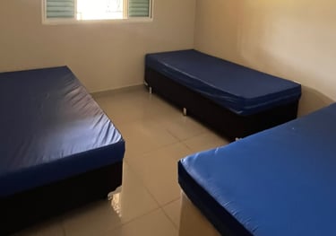 3 camas box de solteiro, ventilador de teto, travesseiros e tela mosquiteiro.