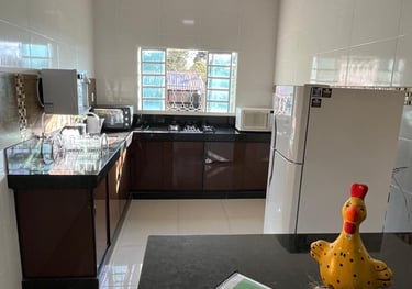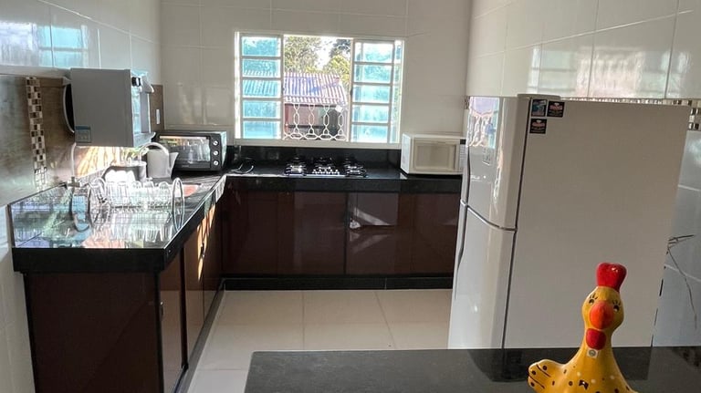 Geladeira, fogão cooktop 5 bocas, microondas, forninho elétrico, bebedouro elétrico e utensílios básicos de cozinha.