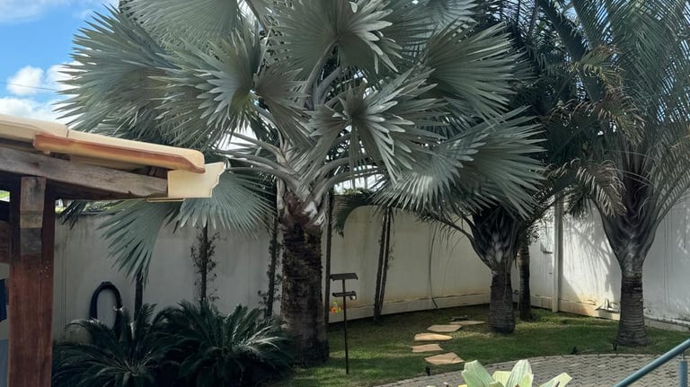 Varanda com vista para o jardim da entrada da casa com iluminação noturna.